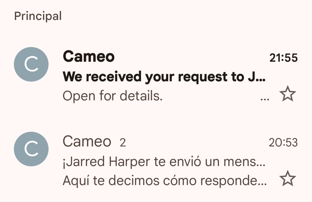 Que subidón al ver el símbolo de cameo en la parte de arriba de mi celular pero no puede ser el vídeo. No tengo ningún mail. Veo que es notificación de un mensaje. Y me entristecí al pensar que no me ha querido grabar el vídeo y me dice el porqué pero sólo es publicidad para que compremos un vídeo suyo que lanza él desde su perfil de la página.